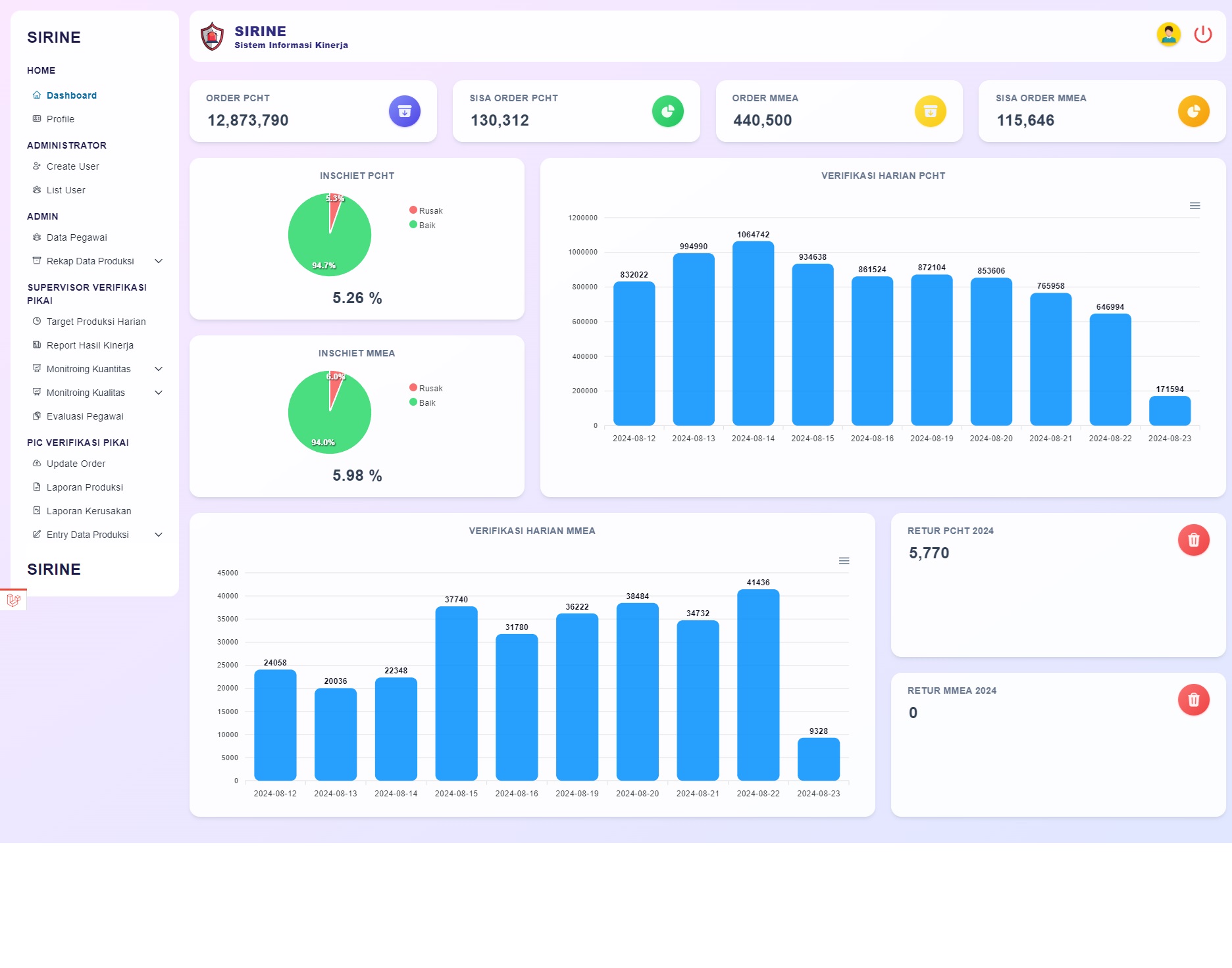 Sistem Informasi Kinerja (SIRINE) adalah aplikasi berbasis web yang dirancang untuk memantau dan menganalisis kinerja produksi. Dengan fitur yang intuitif, SIRINE membantu pengguna dalam mengelola data produksi, memantau performa, dan menghasilkan laporan yang informatif. Aplikasi ini tidak hanya meningkatkan efisiensi operasional, tetapi juga mendukung pengambilan keputusan yang lebih baik, sehingga bisnis Anda dapat tumbuh dan beradaptasi dengan cepat di pasar yang kompetitif.